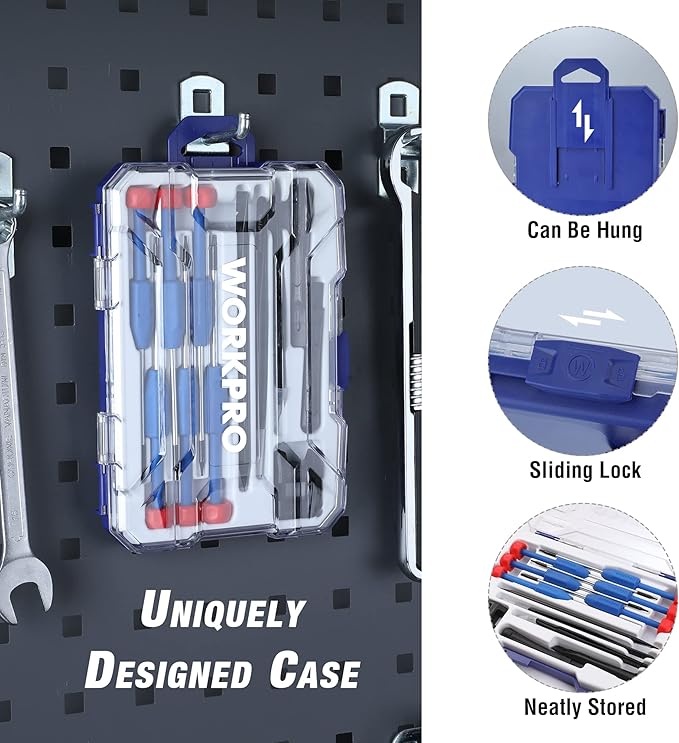 - Uniquely Designed Case: The precision screwdriver set comes with a storage case to keep your tools organized and easy to carry. The Case is well-designed, and it has a sliding hook on the back, which can be hung in any convenient place. The case is also equipped with a sliding lock, allowing you to open and close the case safely and quickly. There is a fixed card slot inside the storage case, which allows the screwdriver to be placed in an orderly manner