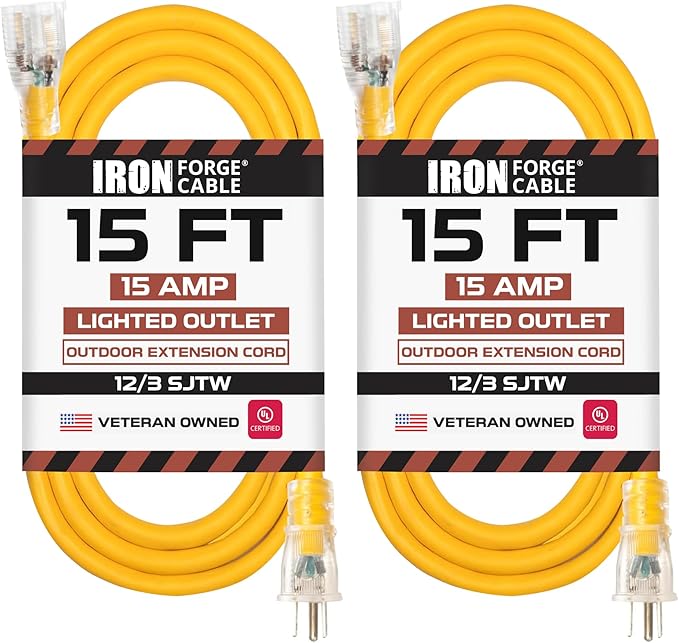 Iron Forge Cable Lighted Outdoor Extension Cord 15 ft 2 Pack - 12 Gauge 15 Amp Heavy Duty Power Extension Cords - SJTW - Great for Major Appliances, Power Tools, Garden Supplies - Yellow