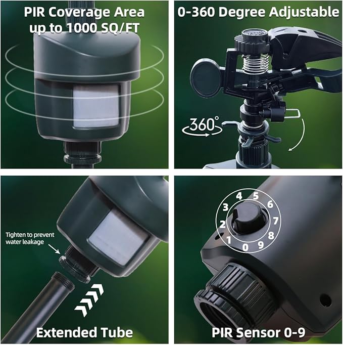 - Easy to set up | Motion sprinkler head can be adjusted 360 degrees, with a maximum detection range of 1000 square feet and a detection angle of 120 degrees. The sensitivity of the animal repellent can be adjusted according to your needs
