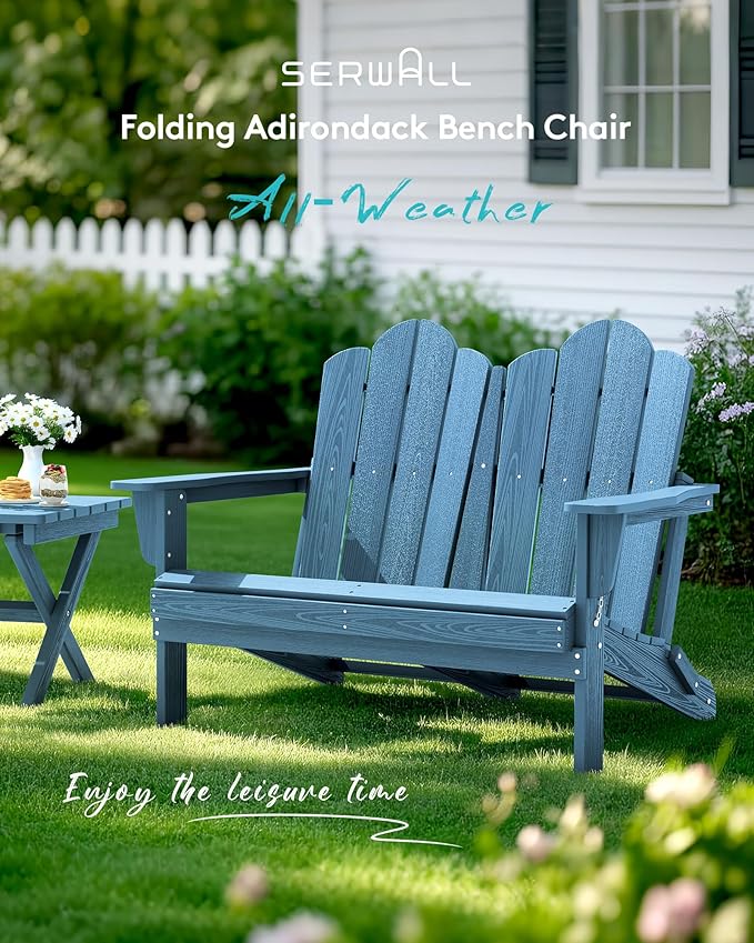- [Durable HDPE Material] The SERWALL folding Adirondack bench is crafted from high-density polyethylene (HDPE), offering exceptional durability and weather resistance. This material ensures your bench remains in pristine condition, withstanding harsh weather conditions like sun, snow, and wind. It's designed to resist cracking, peeling, and rotting, making it perfect for outdoor use.