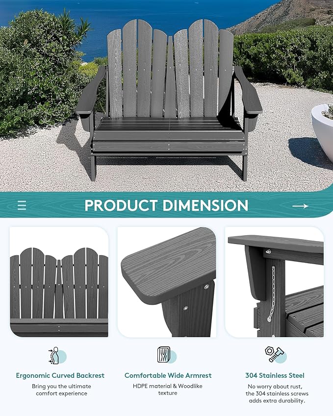 - [All-Weather Durability] Crafted for the great outdoors, our SERWALL 2-seat adirondack chair is designed to stand strong against any weather. From scorching sun to snowy days and coastal winds, the HDPE material and stainless steel hardware ensure it stays durable and functional, making it a reliable addition to your outdoor space.