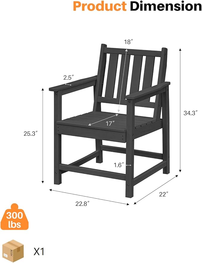 - Eco-Friendly Durable HDPE: Crafted from 100% recyclable, military-grade high-density polyethylene, this 2-pack patio chair set offers long-lasting durability and a realistic wood grain finish. Resistant to fading and UV damage, these eco-friendly chairs bring natural wood look and feel without the maintenance—perfect for all your outdoor settings from patios to pool decks. The obsidian Black finish adds a modern, bold accent that grounds your outdoor setup with sleek sophistication, effortlessly blending strength, sustainability, and contemporary style into one reliable design.