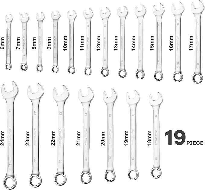 - Diverse Sizes: Includes 19 open end wrench set and 19 box wrench set, suitable for automotive repair, home maintenance, and DIY tasks. Offers 19 wrench set metric options to meet your needs (6mm, 7mm, 8mm, 9mm, 10mm, 11mm, 12mm, 13mm, 14mm, 15mm, 16mm, 17mm, 18mm, 19mm, 20mm, 21mm, 22mm, 23mm, 24mm combination wrenches)