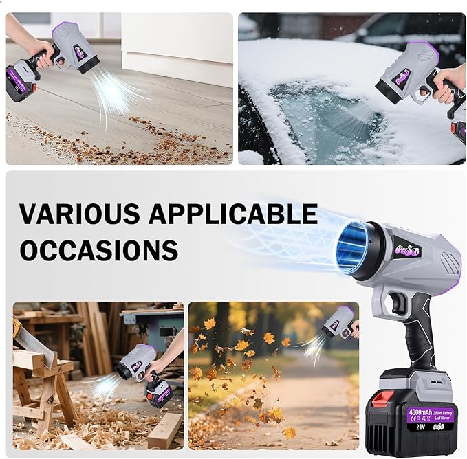 - 【MULTIFUNCTIONAL & PORTABLE】The battery leaf blower is crafted with a lightweight design for easy portability, this cordless blower adapts seamlessly to diverse needs: it excels at household tasks like dusting and leaf blowing, shines for outdoor activities such as camping and barbecuing, and works perfectly for car blow-drying—delivering convenient, hassle-free cleaning wherever you need it.