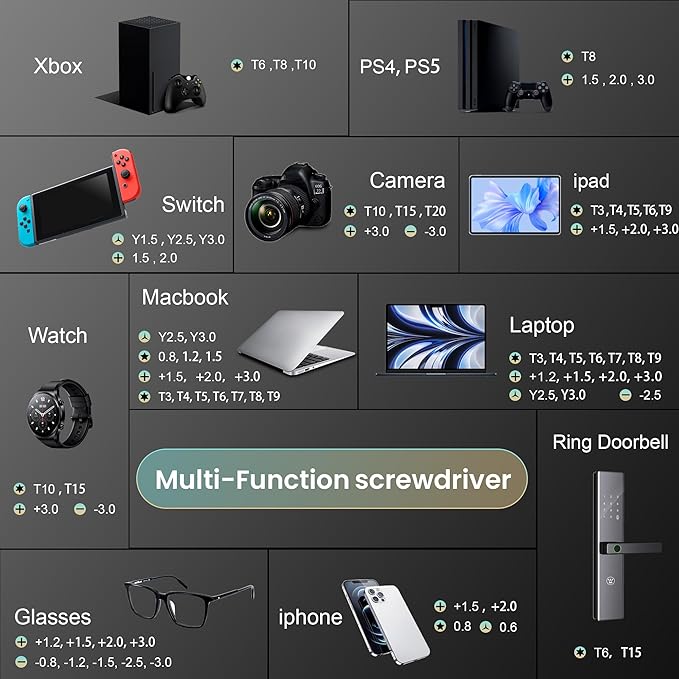 - 【32-in-1 Precision Screwdriver Set】 Contains 32 S2 alloy steel precision bits (including Philips PH000 (+1.2) PH000 (+1.5) PH00 (+2.0) PH0 (+3.0); Flat head screwdriver -0.8 -1.2 -1.5 -2.5 -3.0; Torx T1 T2 T3 T4 T5; Torx security TR6 TR7 TR8 TR9 TR10 TR15; Triwing Y000 (Y0. 6) Y00 (Y1.5) Y0 (Y2.5) Y1 (Y3.0); Pentalobe P2(0.8) P5(1.2) P6( 1.5); Hex H1.5 H2.0 H2.5 H3.0; MID 2.5.), durable and wear-resistant, not easy to slip silk deformation, easy to deal with cell phones, Glasses, toys, laptops and other small electronic products fine disassembly.