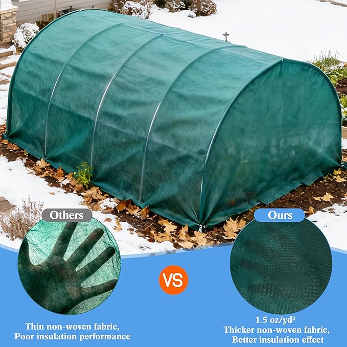- Premium 1.5 oz/yd² Breathable Non-Woven Fabric: Crafted from high-quality 1.5 oz/yd² non-woven fabric, this plant cover boasts durability and excellent breathability. It features UV resistance, cold protection, and thermal insulation properties, while still allowing sunlight penetration – a key advantage for maintaining optimal temperatures around plants. This balanced design supports healthy growth by shielding plants from harsh elements without compromising essential light exposure